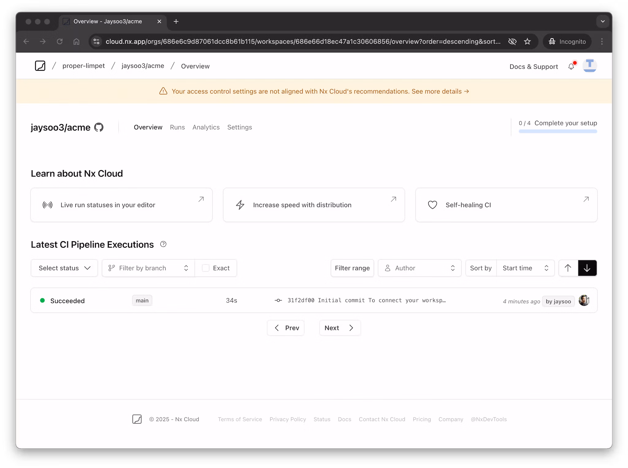 If you do not see your workspace in Nx Cloud then please follow the steps outlined in the Nx Cloud setup.